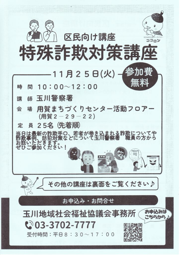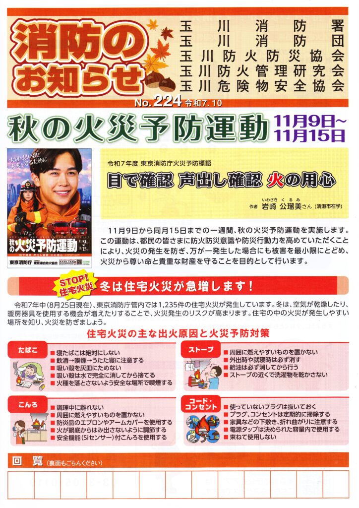 回覧板(2025年11月3日配布) 2025 11/04 回覧板 2025年11月4日 目次消防のお知らせ No.224 令和7年10月 世田谷区 清掃工場 環境フェア2025 区民向け講座 特殊詐欺対策講座 玉川地域社会福祉協議会事務所 世田谷区 住まいの防犯対策サポート事業 回覧板