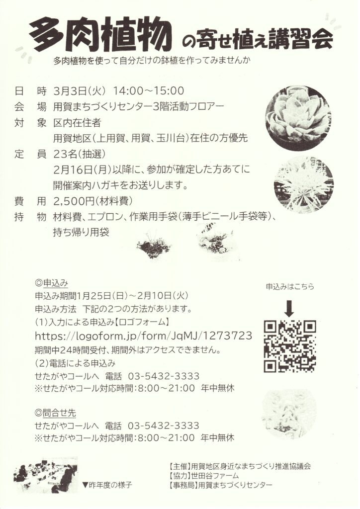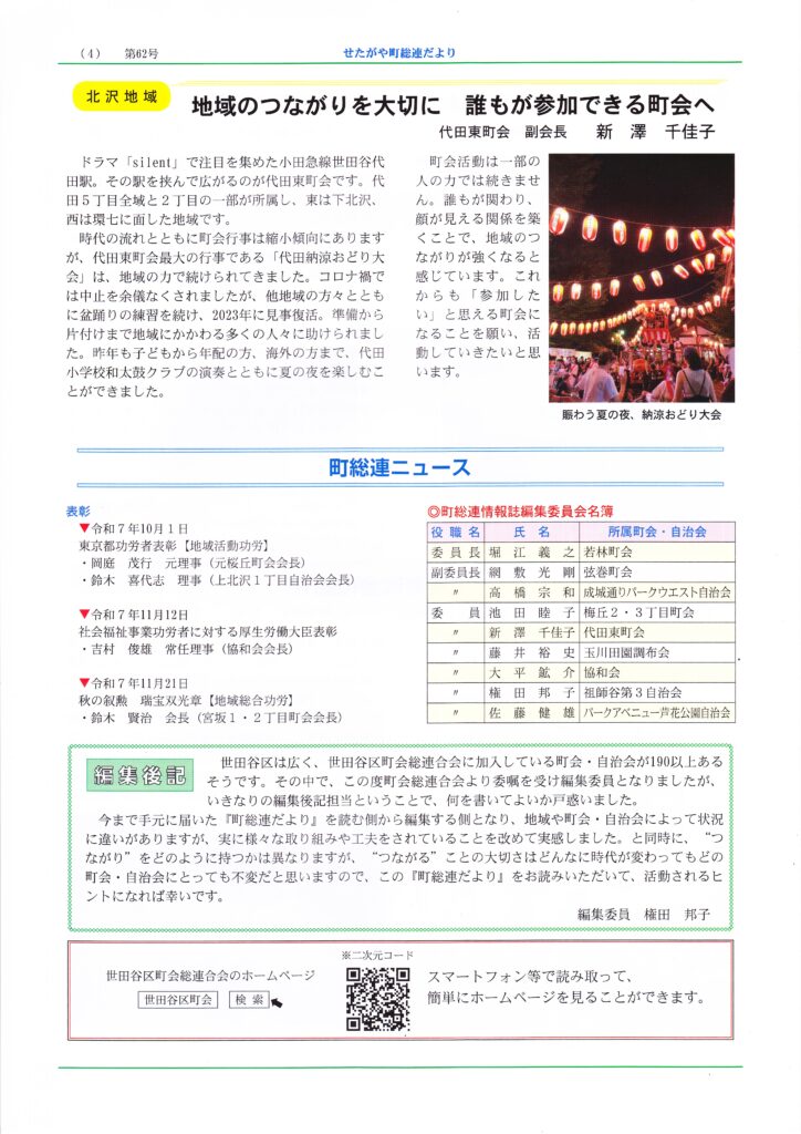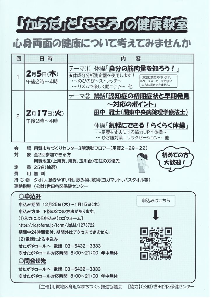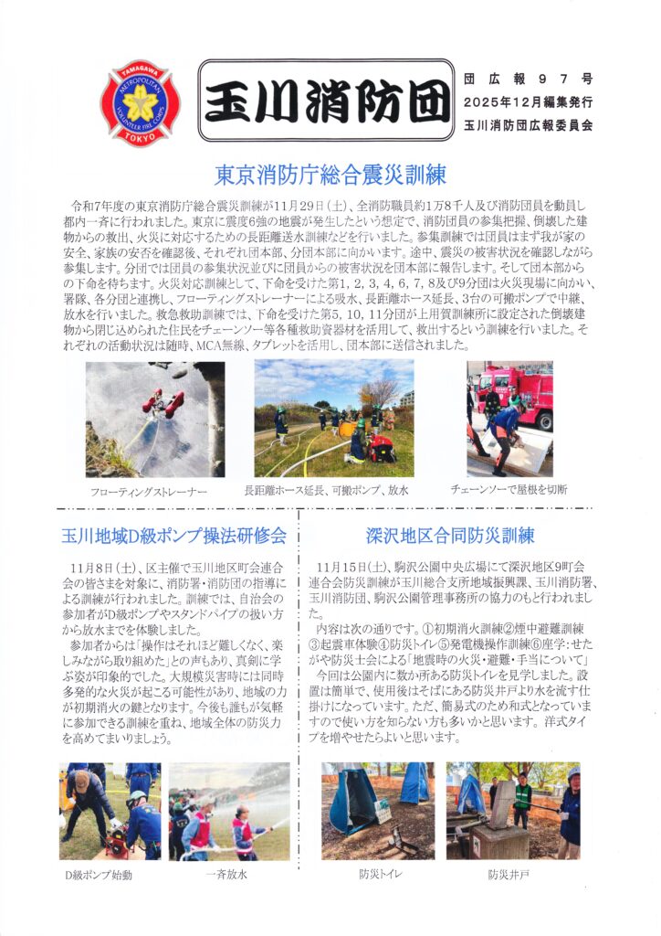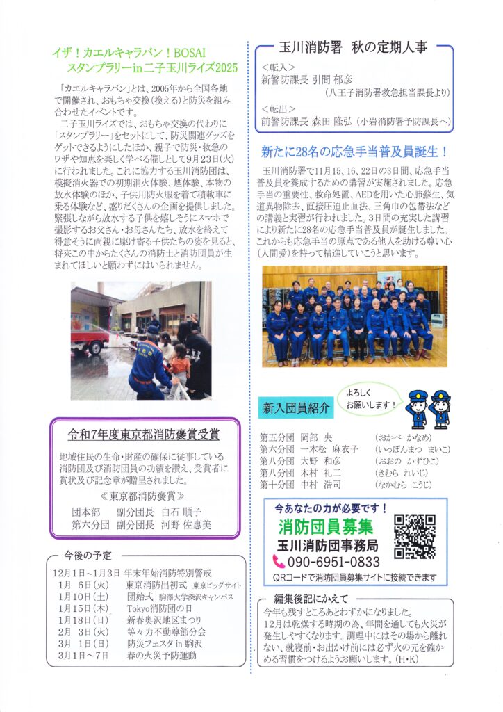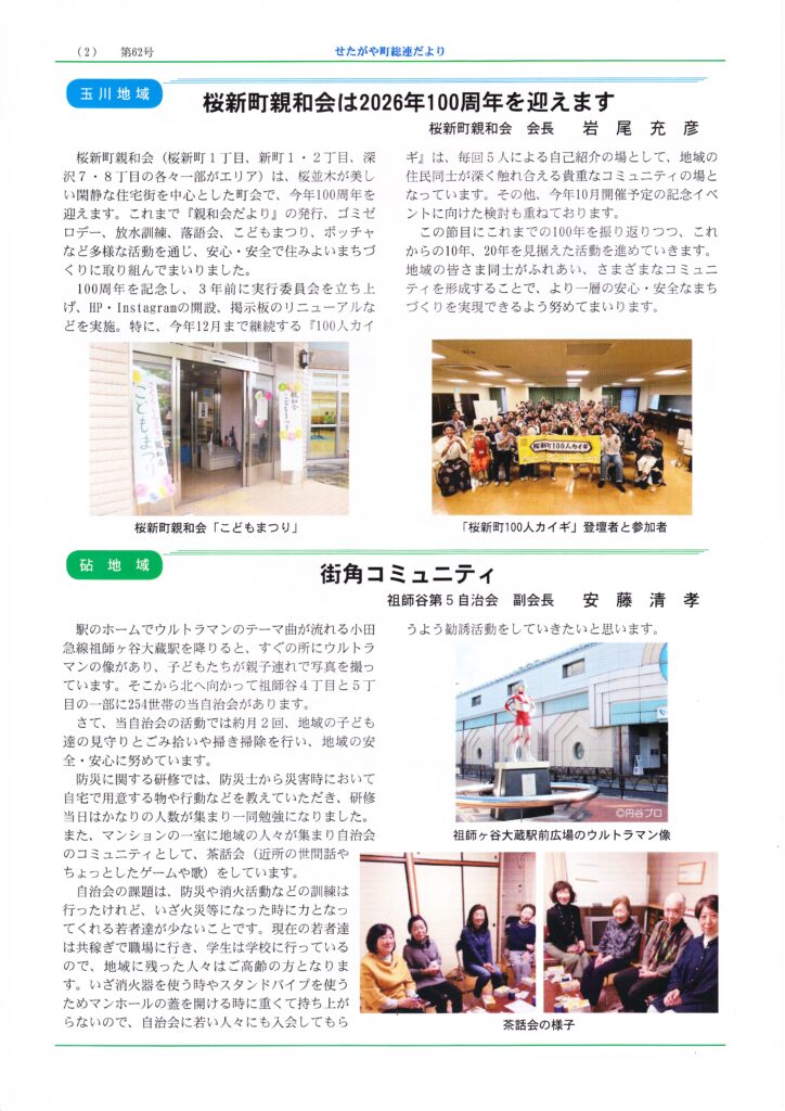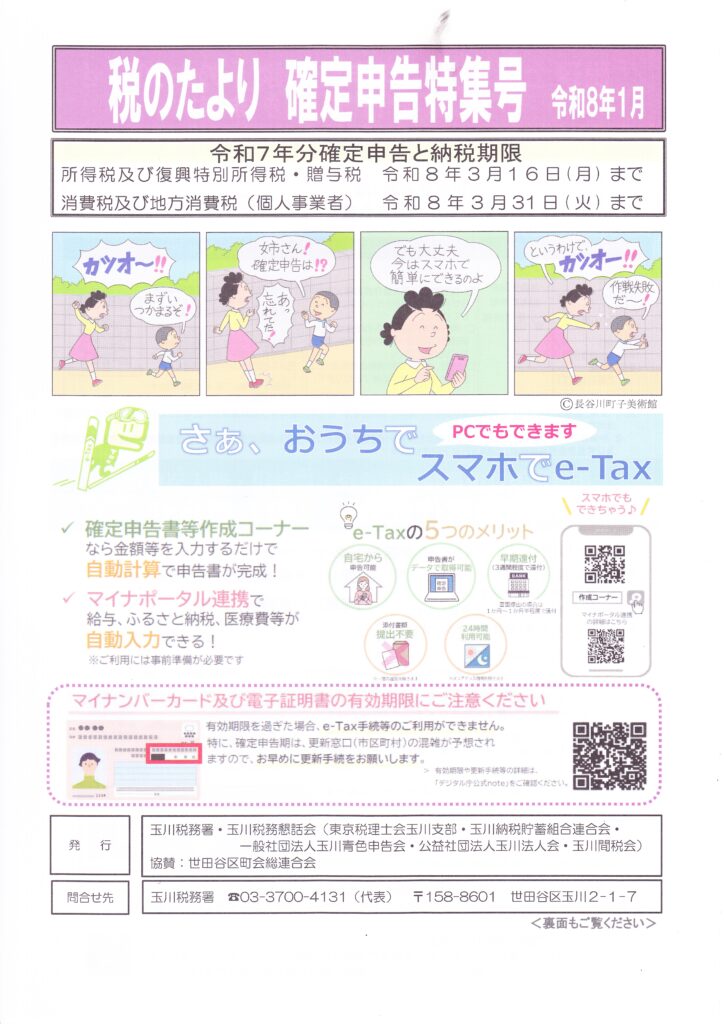 回覧板(2026年1月9日配布) 2026 1/13 回覧板 2026年1月13日 目次「からだ」と「こころ」の健康教室 用賀地区身近なまちづくり推進協議会 ふれあいサービス協力会員登録説明会 玉川地域社会福祉協議会 多肉植物の寄せ植え講習 用賀地区身近なまちづくり推進協議会 玉川消防団 団広報97号 税のたより 確定申告特集号 令和8年1月 玉川税務署・玉川税務懇談会 せたがや町総連だより 第62号 世田谷区町会総合連合会 回覧板