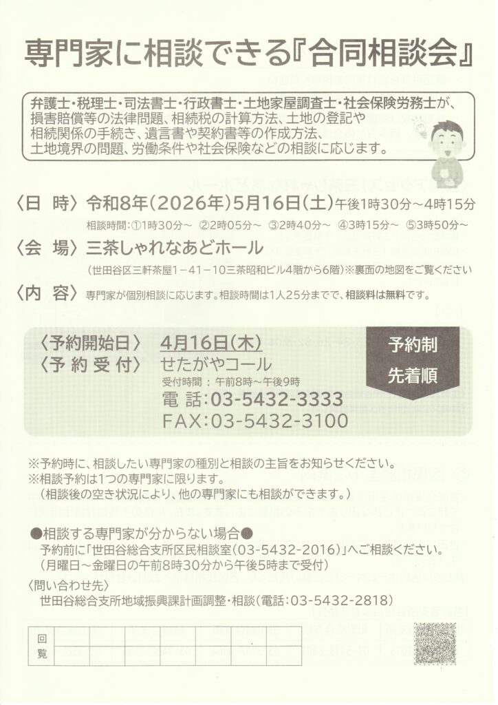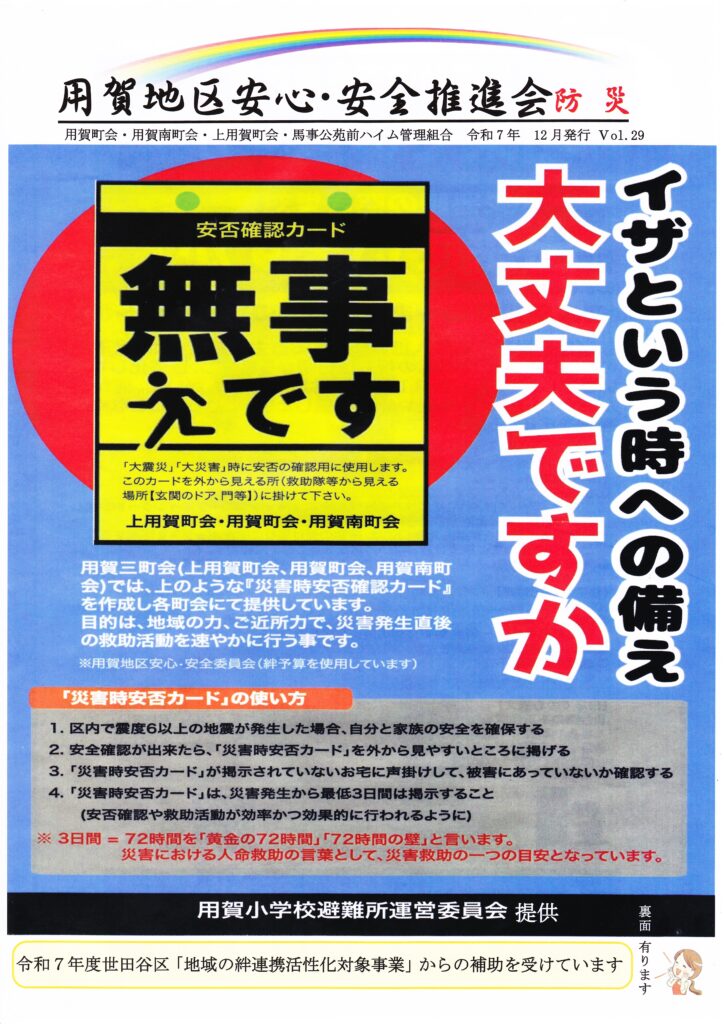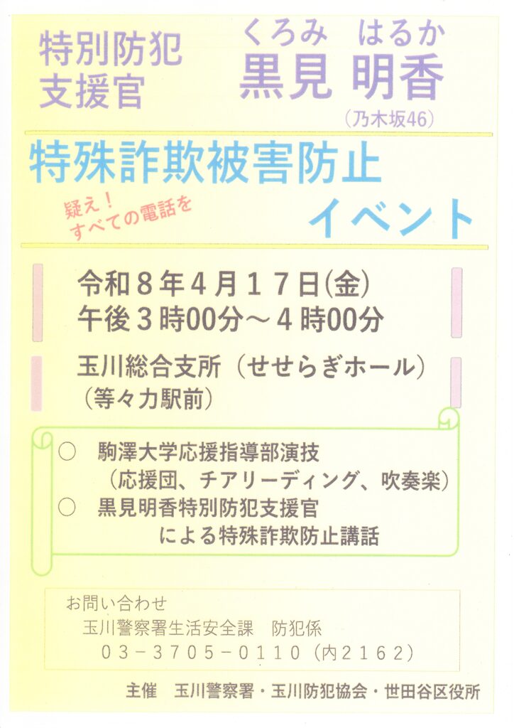 回覧板(2026年3月17日配布) 2026 3/18 回覧板 2026年3月18日 目次用賀地区安心・安全推進会 (防災) Vol.29 専門家に相談できる『合同相談会』 特殊詐欺被害防止イベント かみようがじどうかん 4月 回覧板
