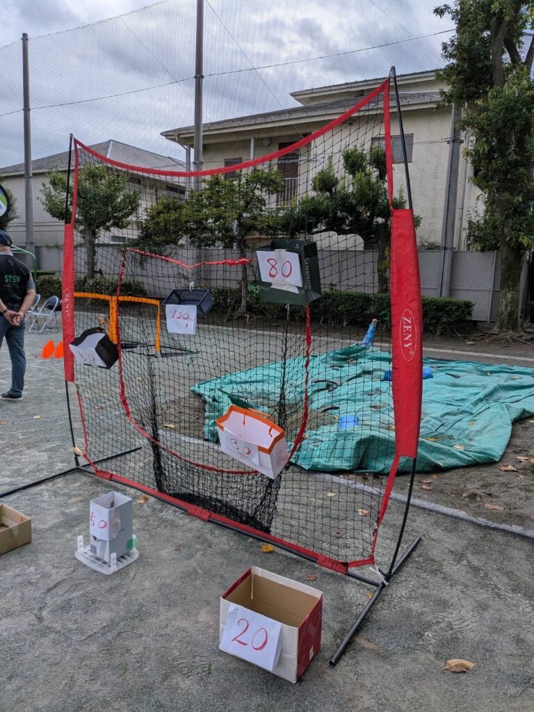 得点のつけられた大きさの異なる箱や紙袋に投げて入れるゲームです。